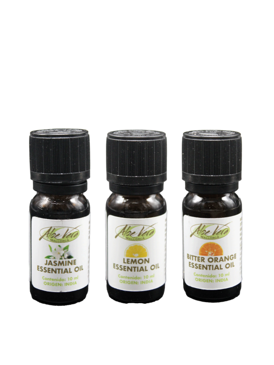 Æteriske Olie Sæt Energi & Livsglæde – Oplev planternes kraft med jasmin-, bitterappelsin- og citronolie fra Aloe Vera Farm Mallorca. Naturlig, vegansk og 100% ren – til ny energi, mental klarhed og følelsesmæssig balance. Perfekt som duft i diffuser, til aromamassage, afslappende bade eller bevidste pauser. Gennemsigtige ingredienser, bæredygtig produktion og mærkbare resultater. Læs mere om NatureIdent på aloe-mallorca.com.