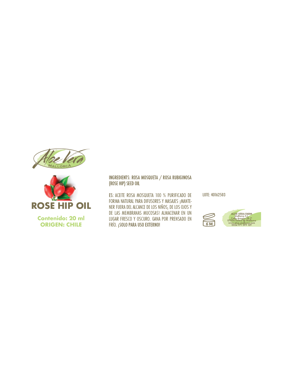 Experimente nuestro aceite de semillas de rosa mos queta de Aloe Vera Farm Mallorca, prensado en frío a partir de las semillas (escaramujos) de la rosa silvestre (Rosa rubiginosa). Estas rosas silvestres crecen principalmente en el sur de los Andes de Chile. El aceite puro tiene un aroma terroso, especiado y herbáceo, un color natural anaranjado-rojizo y una consistencia ligeramente viscosa.