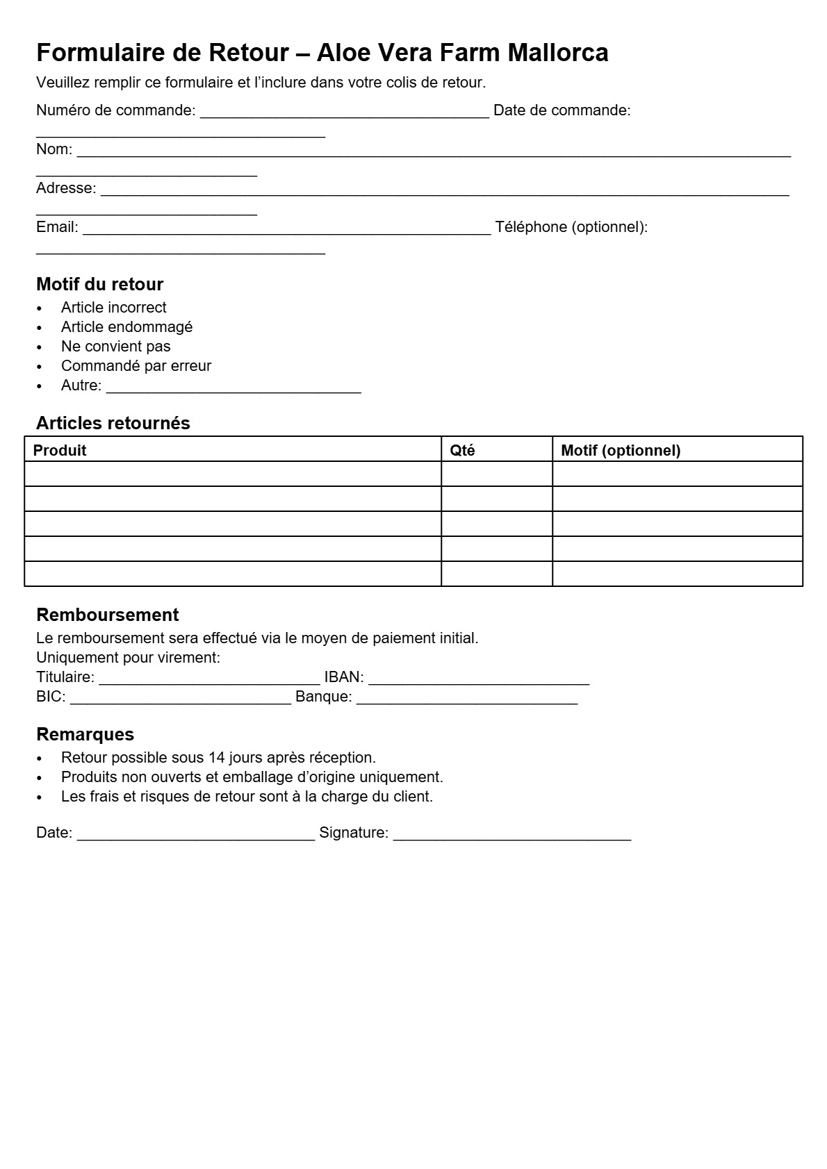 Veuillez joindre le formulaire de retour dûment rempli à votre colis. Vous le trouverez ici : Formulaire de retour