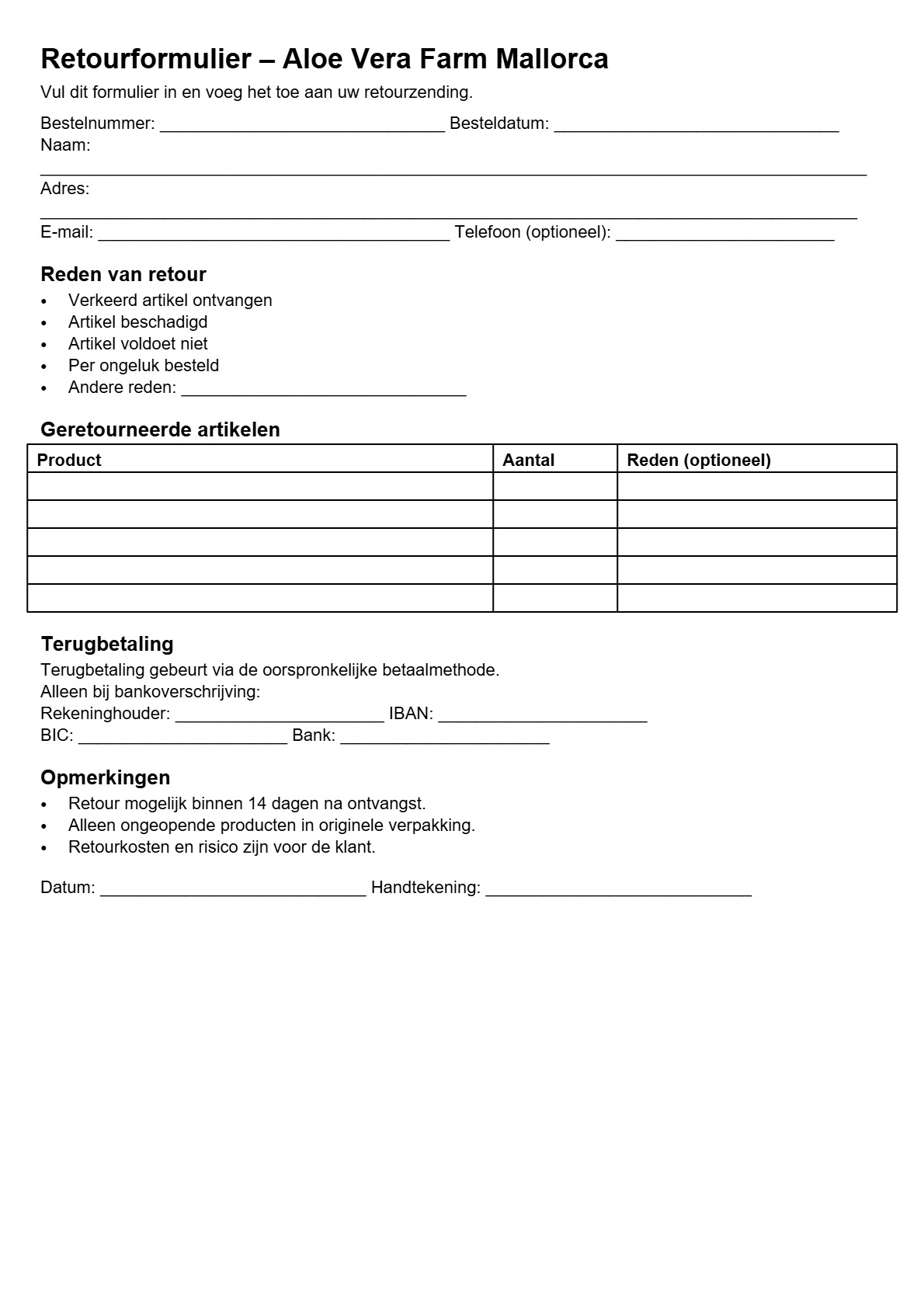U hebt het recht om uw bestelling binnen 14 dagen na ontvangst van de goederen te retourneren.